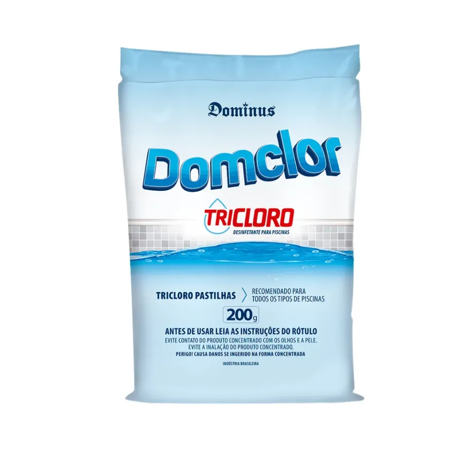 • Tricloro Domclor, agente oxidante e desinfetante para águas de piscinas, atua de forma imediata contra bactérias, algas, fungos e outros contaminantes presentes na água. Seu poder oxidante transforma microrganismos em gases e decompõe produtos orgânicos que pode causar alterações na coloração e odores indesejáveis na água.
